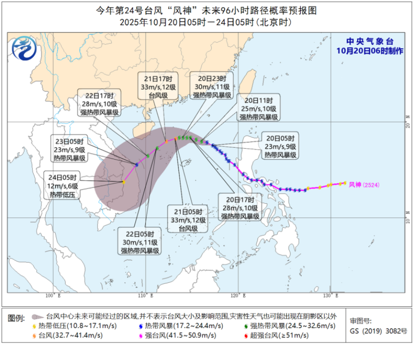 未来三天,受“风神”及外围环流影响,台湾岛东部和北部、福建沿海、广东沿海、海南岛及南海北部海域将有强风雨天气。预计,20日08时至21日08时,台湾岛北部有大到暴雨,局地大暴雨(100-200毫米)。中央气象台10月20日06时继续发布台风蓝色预警。