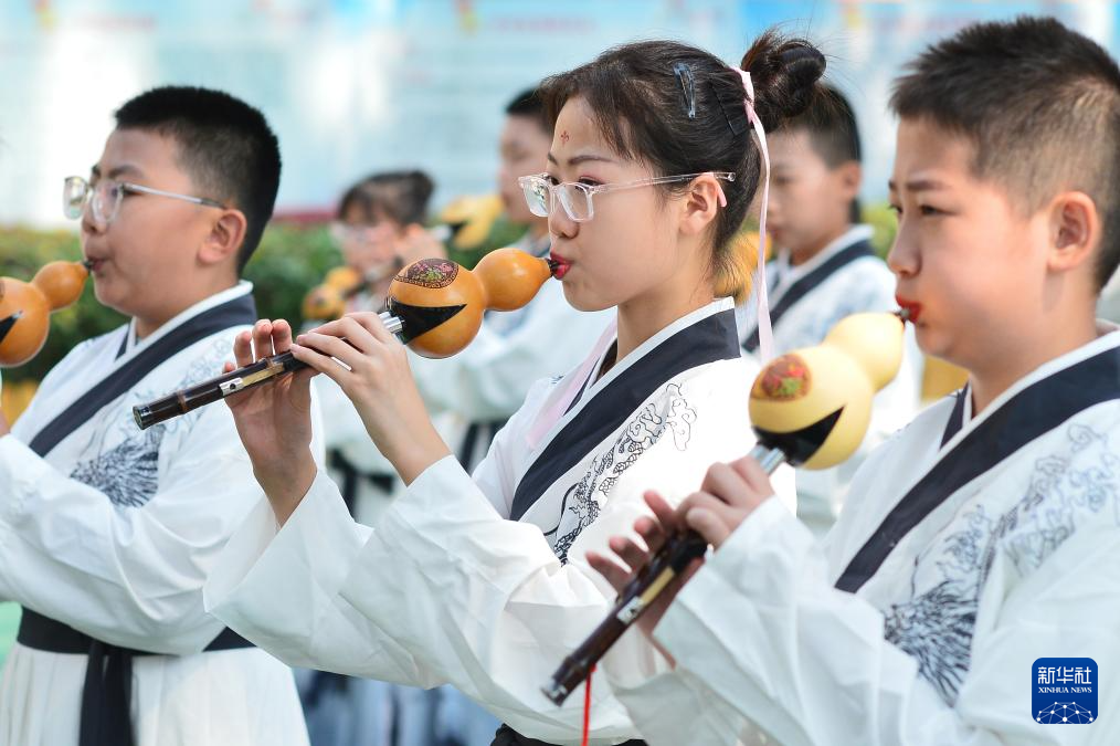 9月26日,在山东青岛陵县路小学开展的国庆主题活动上,小学生在表演葫芦丝。新华社发(王海滨摄)