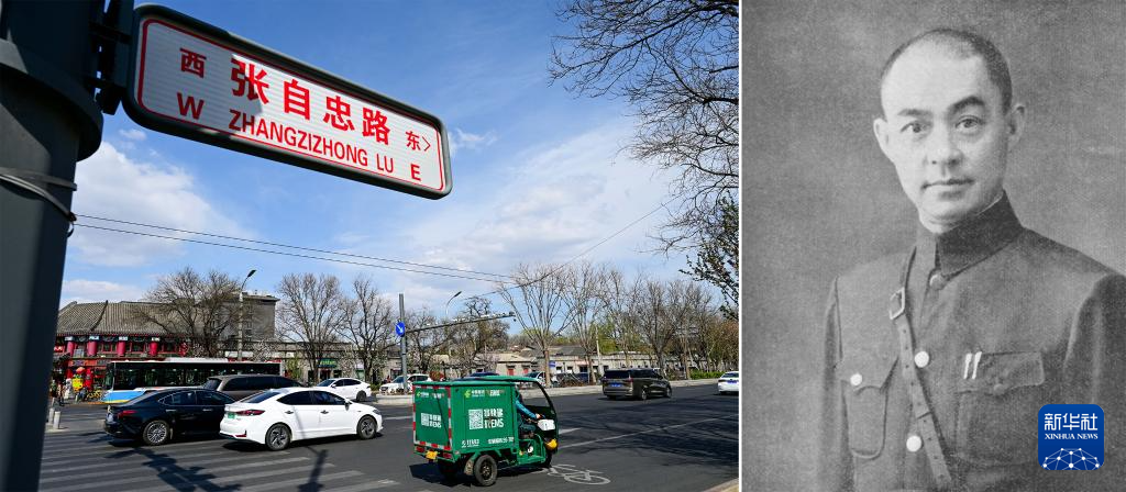 拼版照片:左图为北京市东城区张自忠路(新华社记者刘金海2025年3月27日摄);右图为张自忠像(资料照片)。新华社发