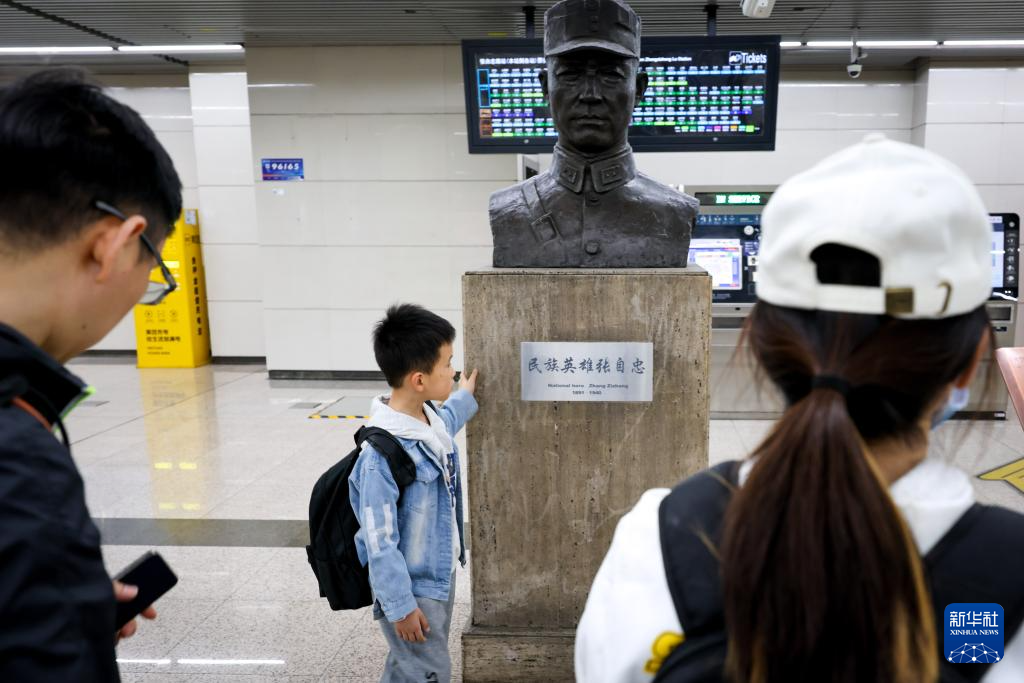 在北京地铁张自忠路站,乘客们瞻仰张自忠将军像(4月4日摄)。新华社记者 刘金海 摄