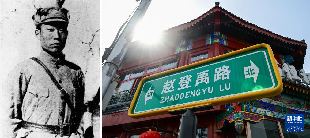 拼版照片:左图为赵登禹像(资料照片);右图为北京市西城区赵登禹路(新华社记者刘金海2025年3月26日摄)。新华社发