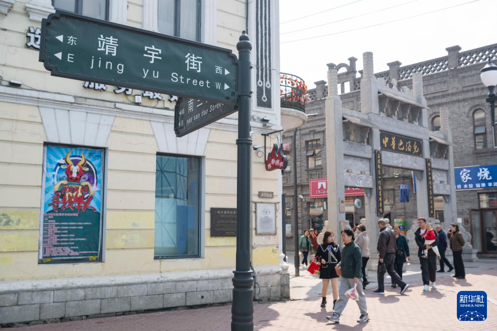 4月8日,在哈尔滨市道外区,人们在靖宇街旁的中华巴洛克历史文化街区游玩。新华社记者 谢剑飞 摄