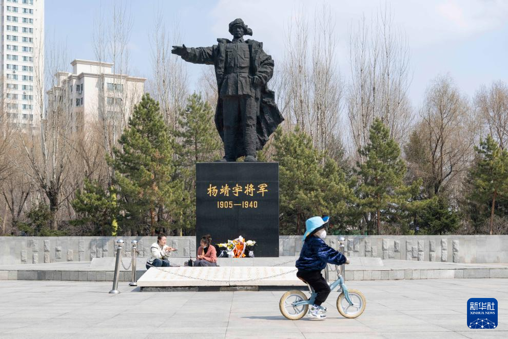 4月8日,在哈尔滨市道外区靖宇街东端的靖宇公园,家长带着孩子在杨靖宇塑像附近享受休闲时光。新华社记者 谢剑飞 摄