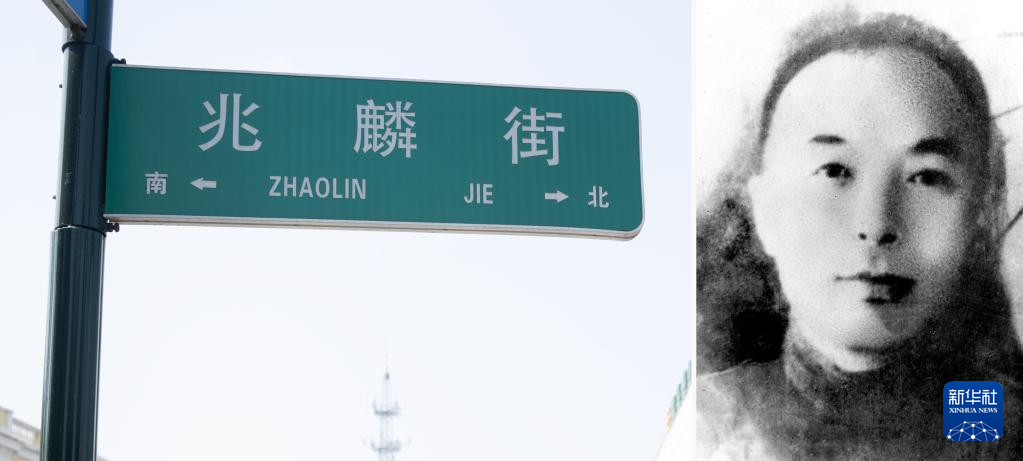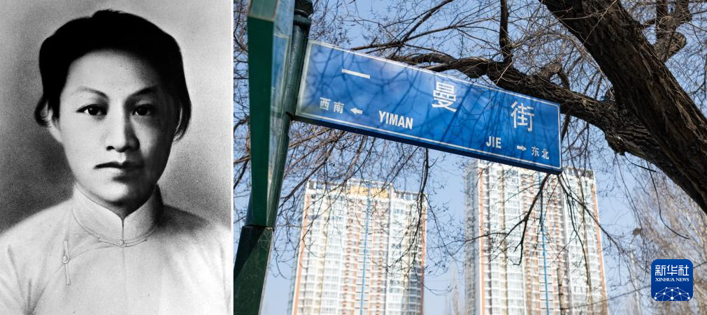 拼版照片:右图为哈尔滨市南岗区一曼街(新华社记者谢剑飞2025年4月8日摄);左图为赵一曼像(资料照片)。新华社发