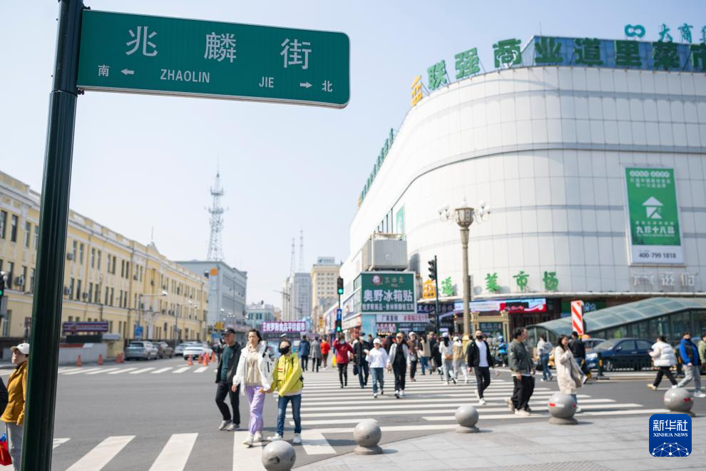 4月8日,在哈尔滨市道里区,人们行走在兆麟街上。新华社记者 谢剑飞 摄