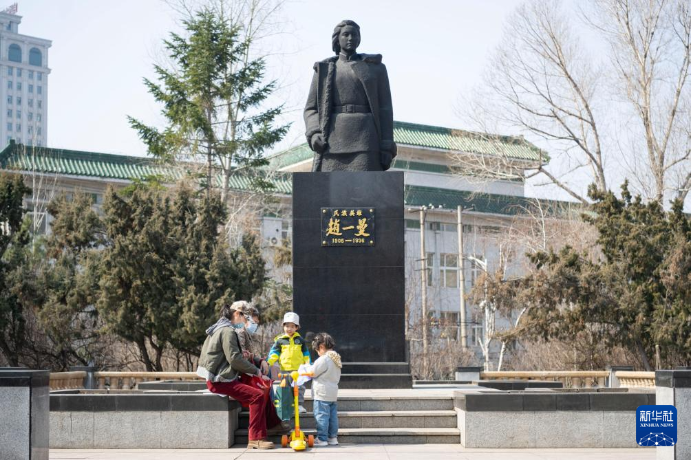4月8日,在位于哈尔滨市南岗区一曼街上的一曼公园内,家长带着孩子在赵一曼塑像旁享受休闲时光。新华社记者 谢剑飞 摄