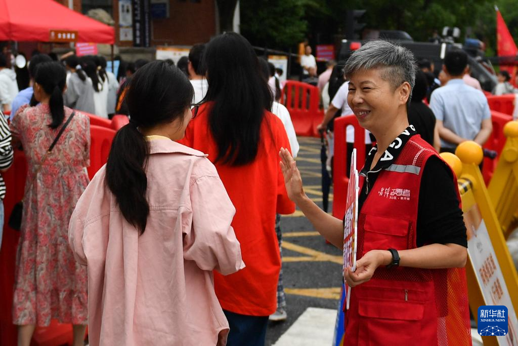 6月8日,志愿者在湖南省天心考区明德中学考点外维持秩序。新华社记者 陈振海 摄