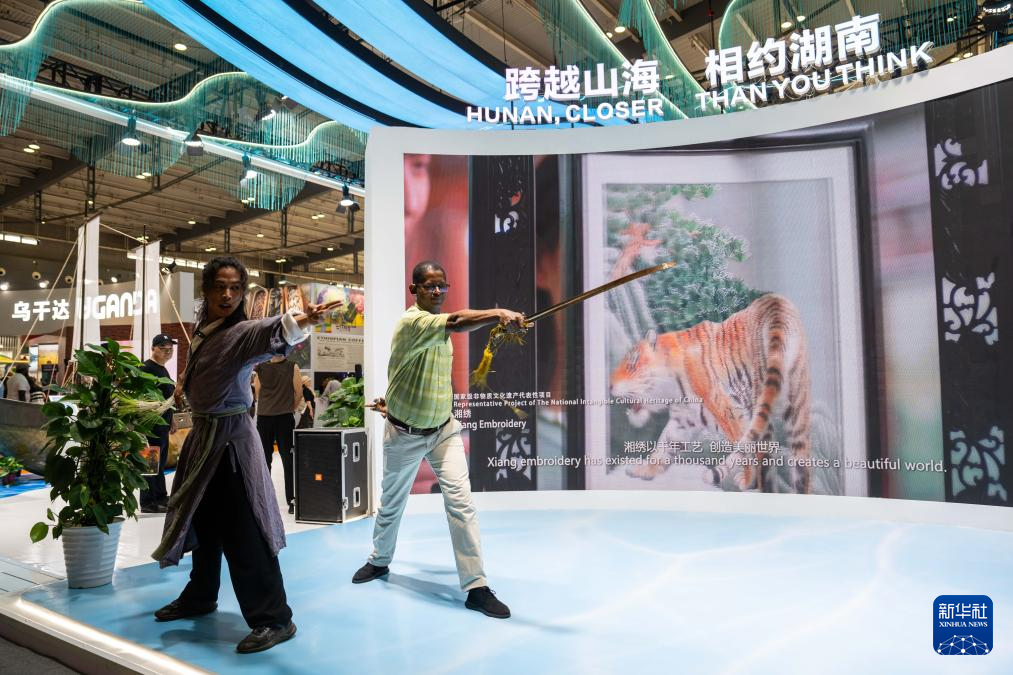 6月13日,在长沙国际会展中心,外国观众(右)在体验中国传统武术。新华社记者 陈思汗 摄