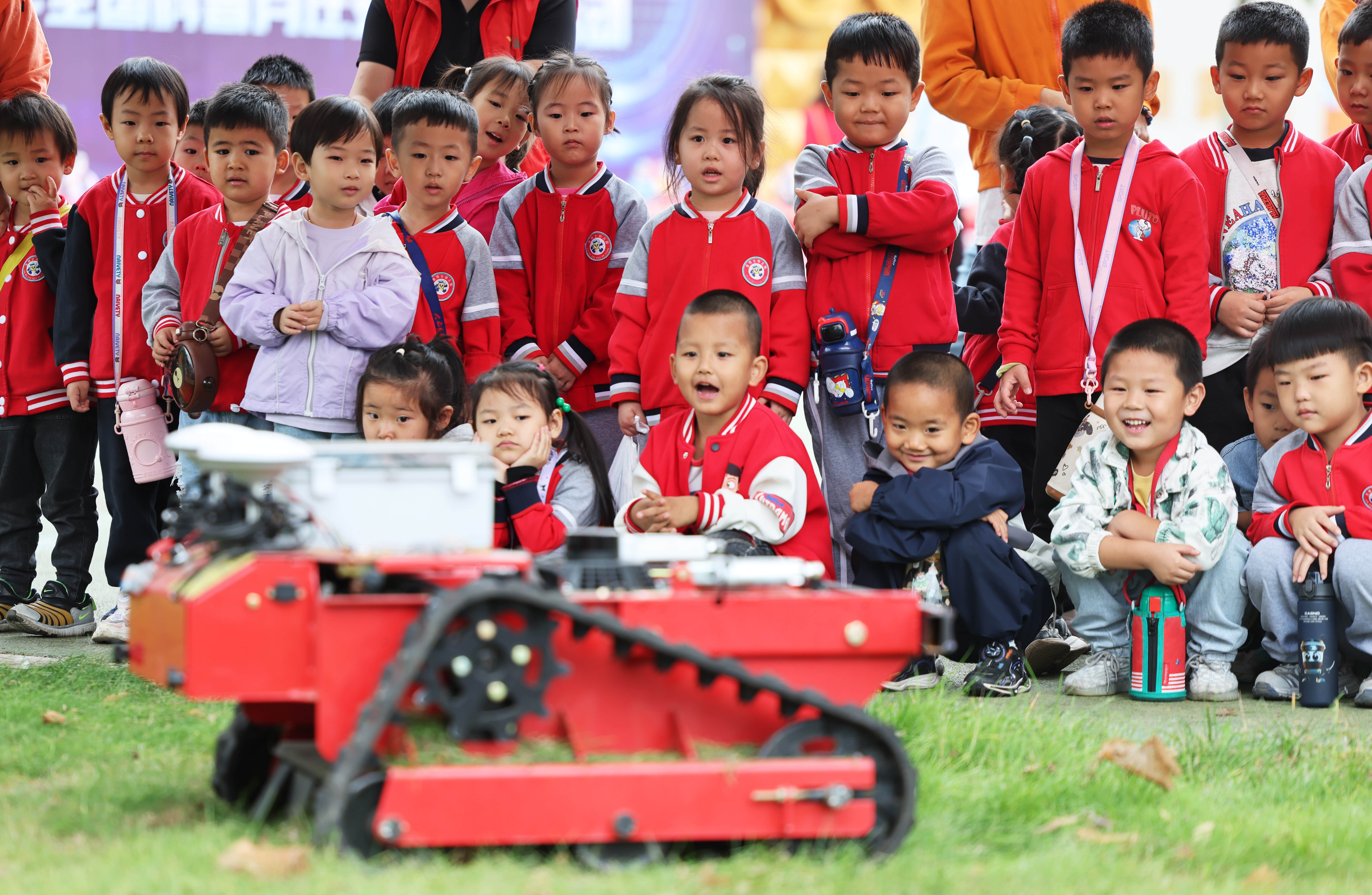 ↑9月23日,河北省迁安市组织150余名幼儿园儿童来到亚滦湾农业公园开展研学活动。这是小朋友在亚滦湾农业公园观看割草机器人作业。新华社记者 卢烨 摄