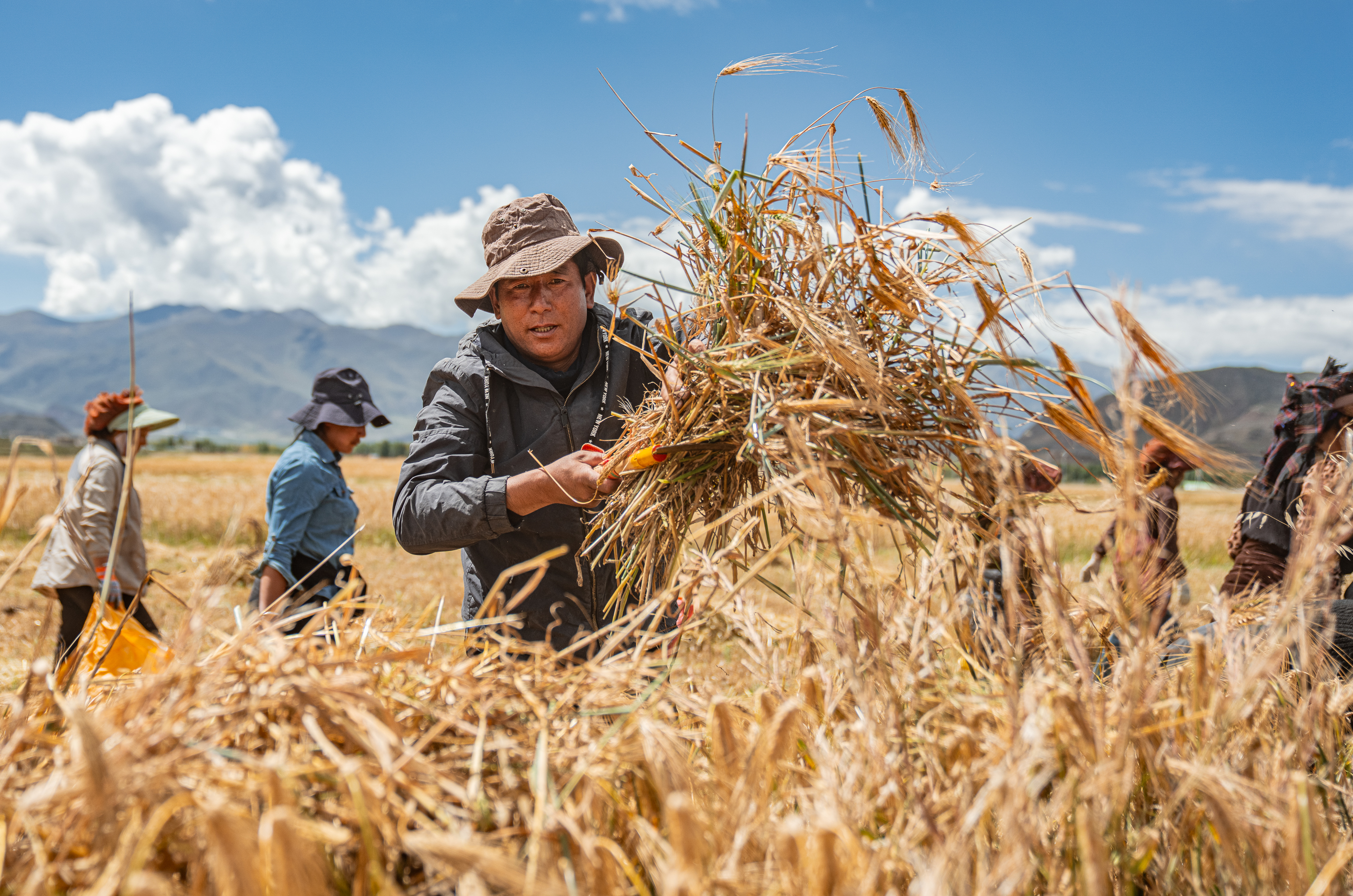 ↑9月23日,西藏拉萨市林周县松盘乡岗巴村农民在收割青稞。新华社记者 丁增尼达 摄