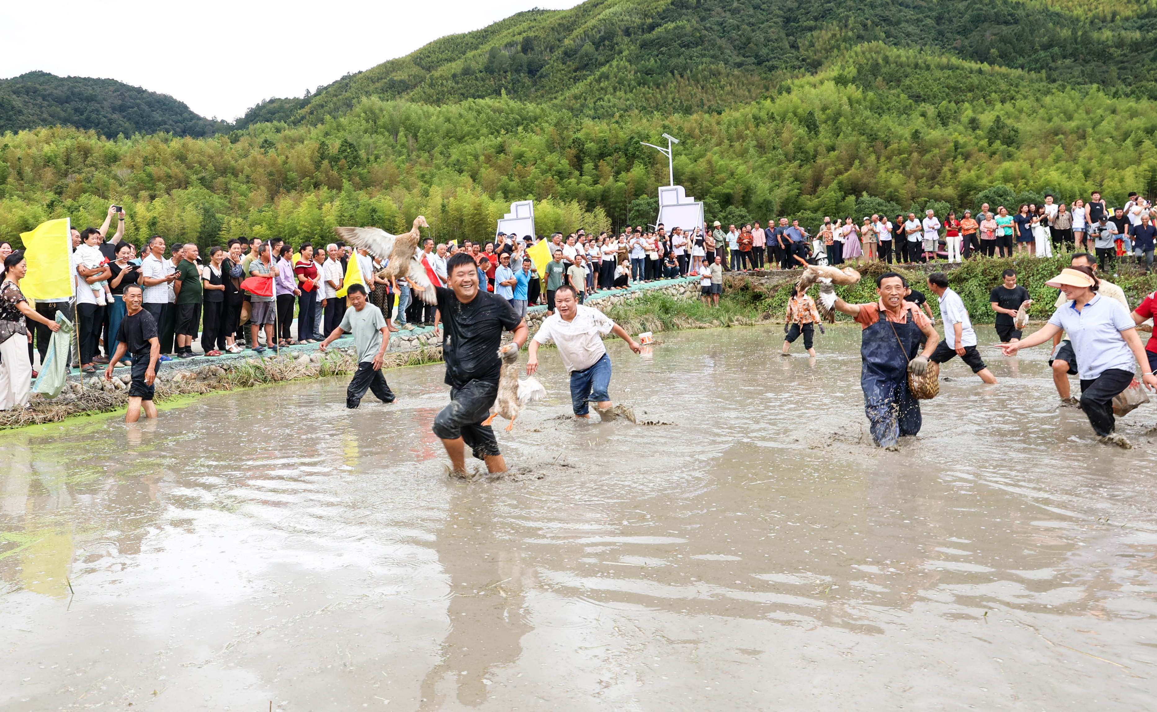 ↑9月23日,在位于福建省三明市建宁县溪源乡楚尾村的丰收节活动现场,选手参加抓鸭子比赛。新华社发(陈震摄)