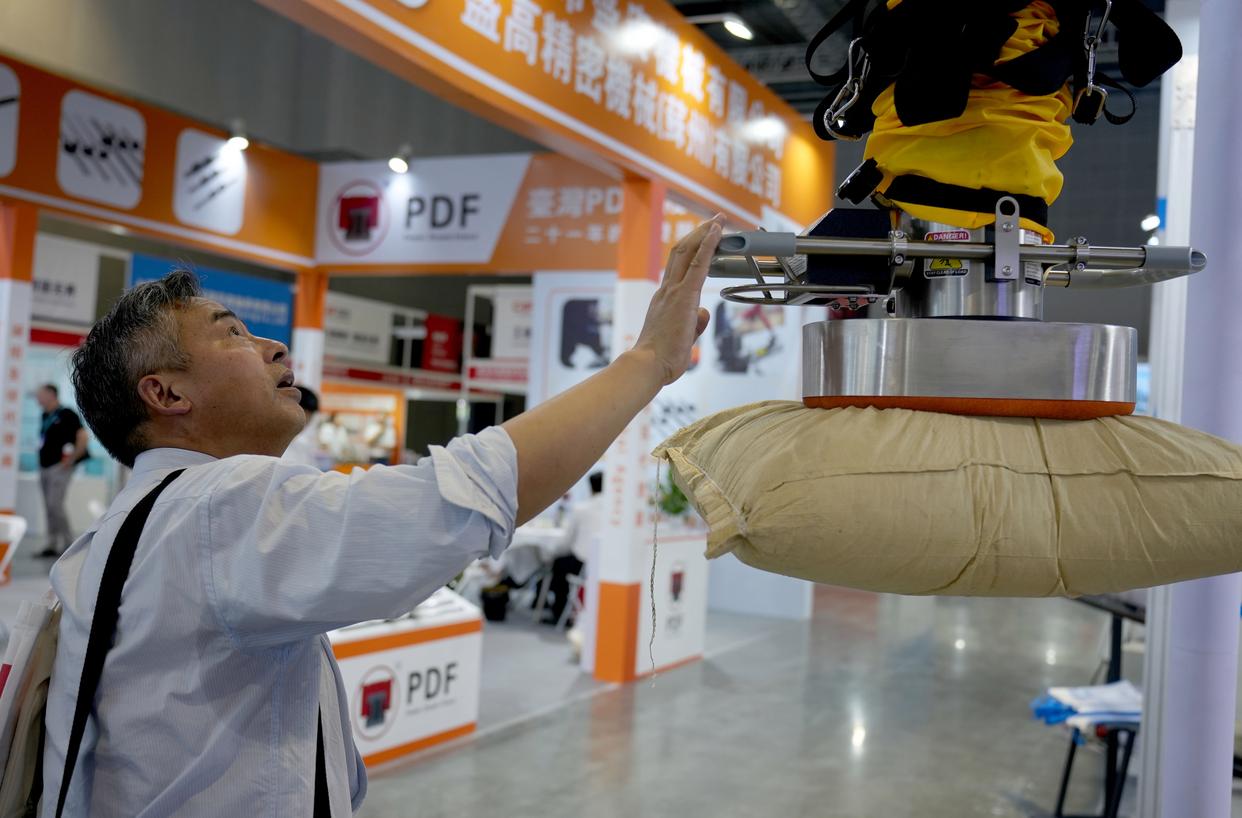 9月23日,参观者在一个重物搬运辅助设备旁驻足观看。新华社发(杨勇摄)