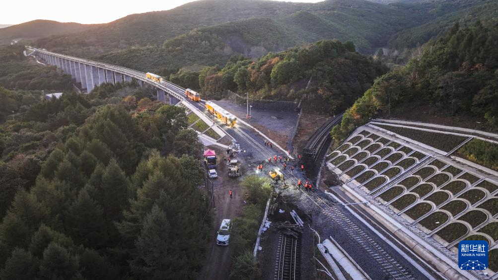 9月26日,施工人员对新线道碴进行填充作业(无人机照片)。新华社发(曲艺伟摄)