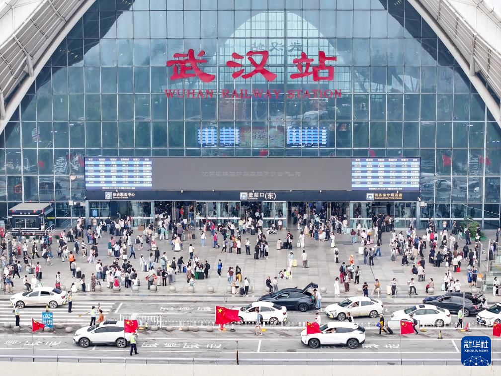 10月1日,旅客在湖北省武汉站东广场进站口准备乘车出行(无人机照片)。新华社发(赵军摄)