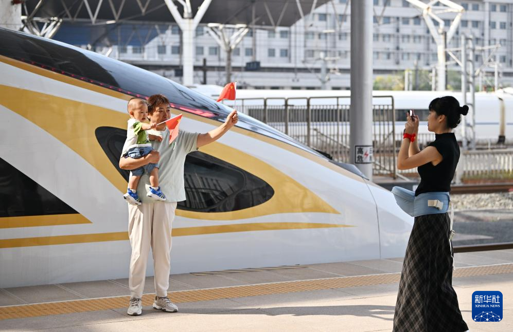 10月1日,旅客在天津站城际列车旁留影。新华社记者 李然 摄