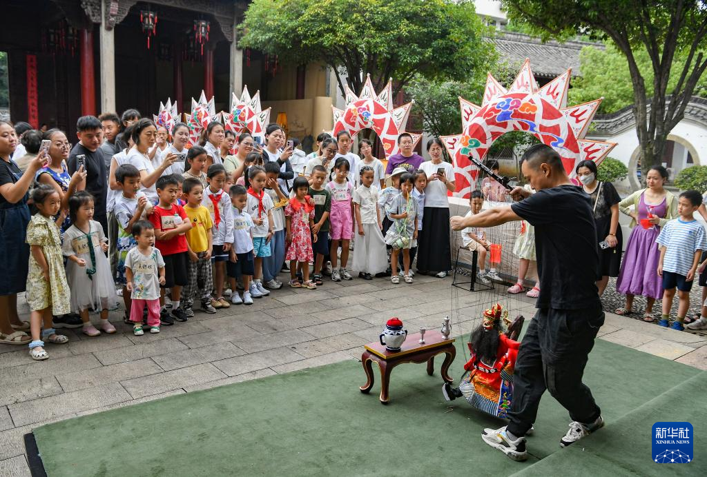10月1日,在浙江省金华市非遗馆,浙江婺剧艺术研究院演员为游客表演提线木偶戏《钟馗醉酒》。新华社发(时宽兵 摄)