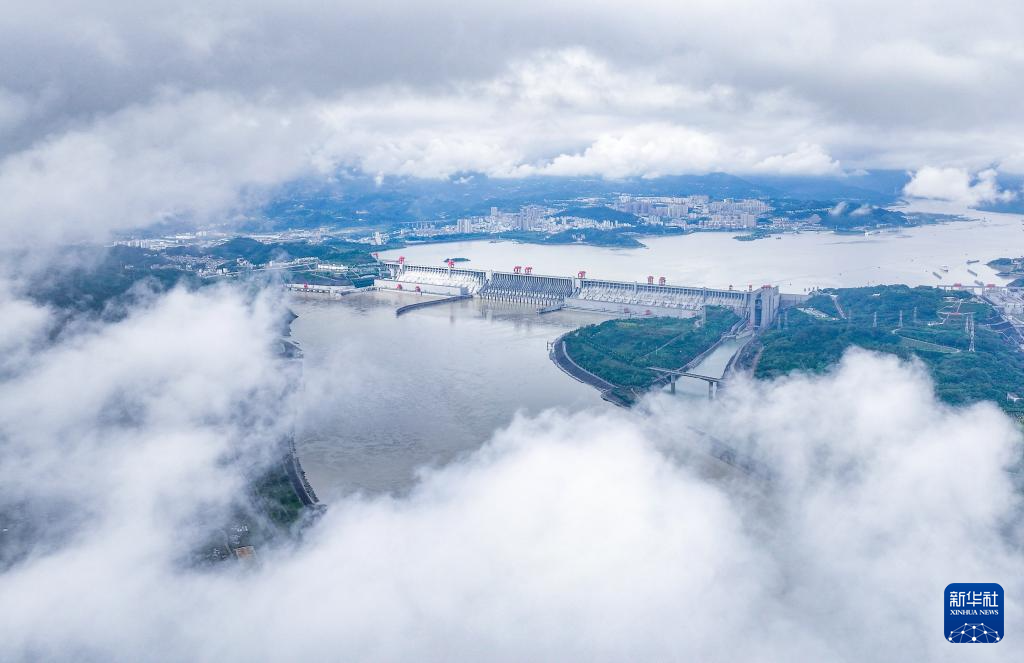 10月4日拍摄的云雾缭绕的三峡大坝(无人机照片)。新华社记者 陈晔华 摄