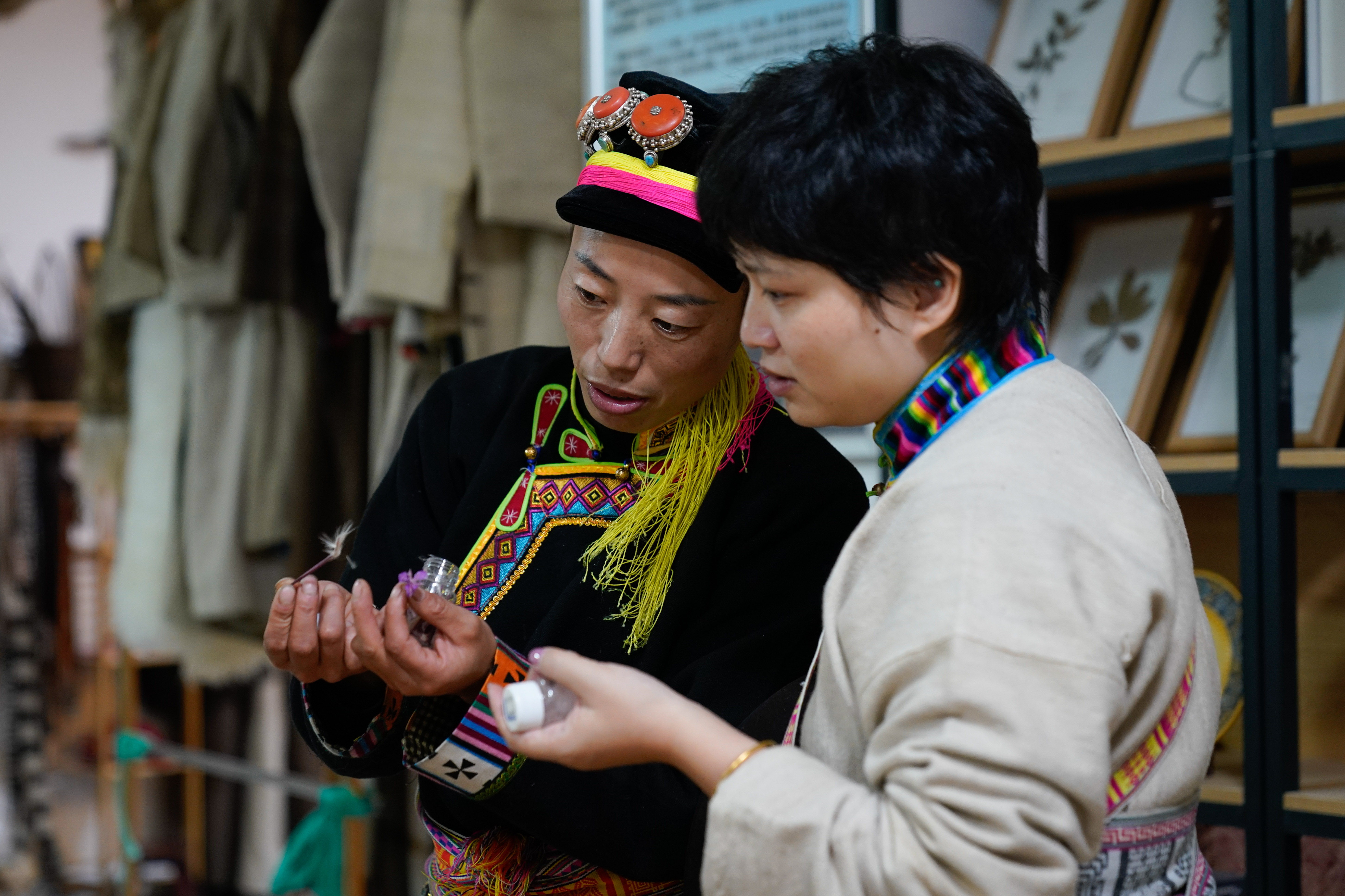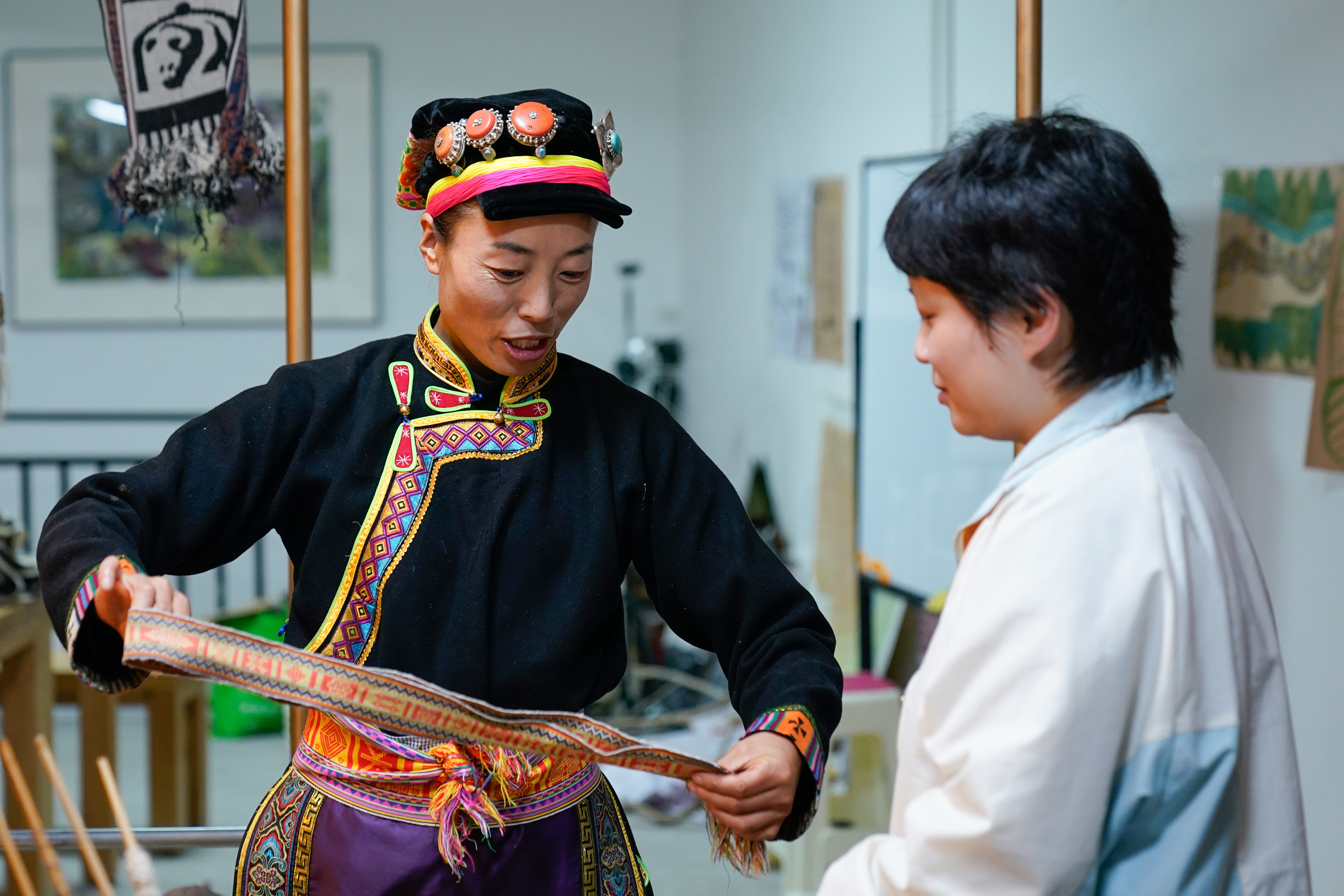 ↑10月7日,能卡曼(左)在工作室里为游客介绍硗碛花腰带编织技艺。新华社记者 胥冰洁 摄