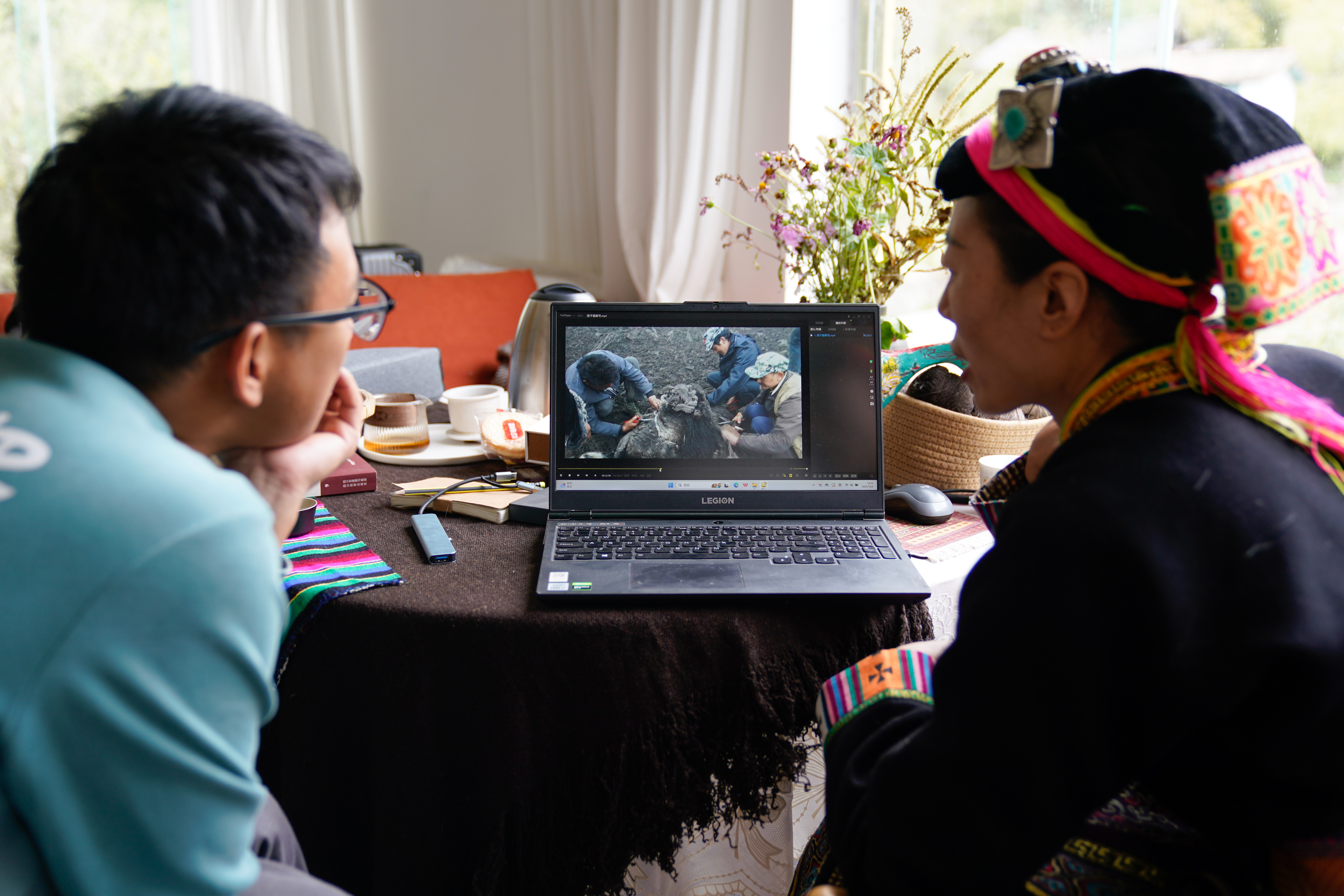 ↑10月8日,能卡曼(右)给在硗碛藏族乡进行调研的研究生卢俊糖展示她拍摄的当地群众剪牦牛毛的视频。新华社记者 胥冰洁 摄
