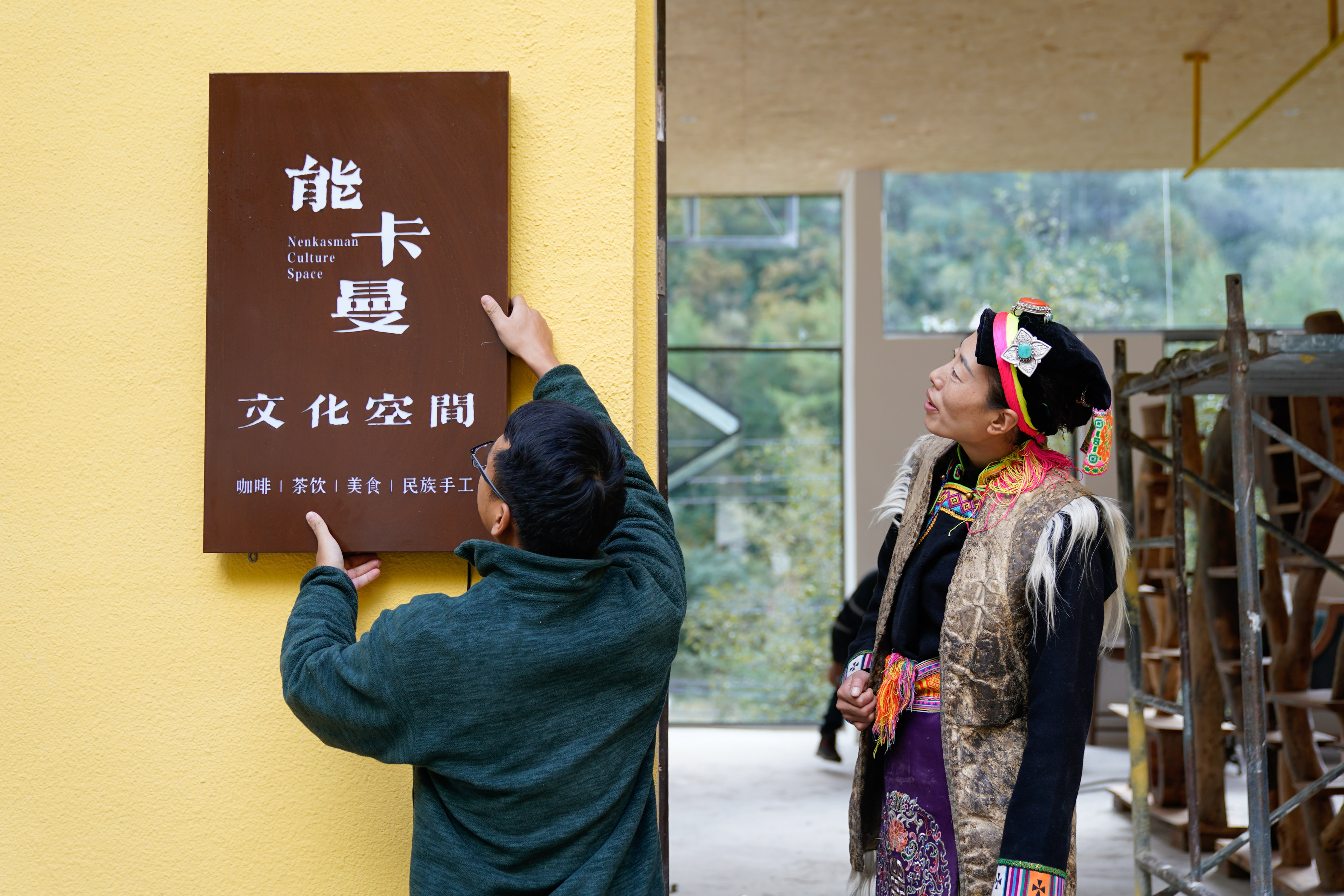 ↑10月8日,能卡曼(右)和在硗碛藏族乡进行调研的研究生卢俊糖装饰即将完工的文化空间。新华社记者 胥冰洁 摄