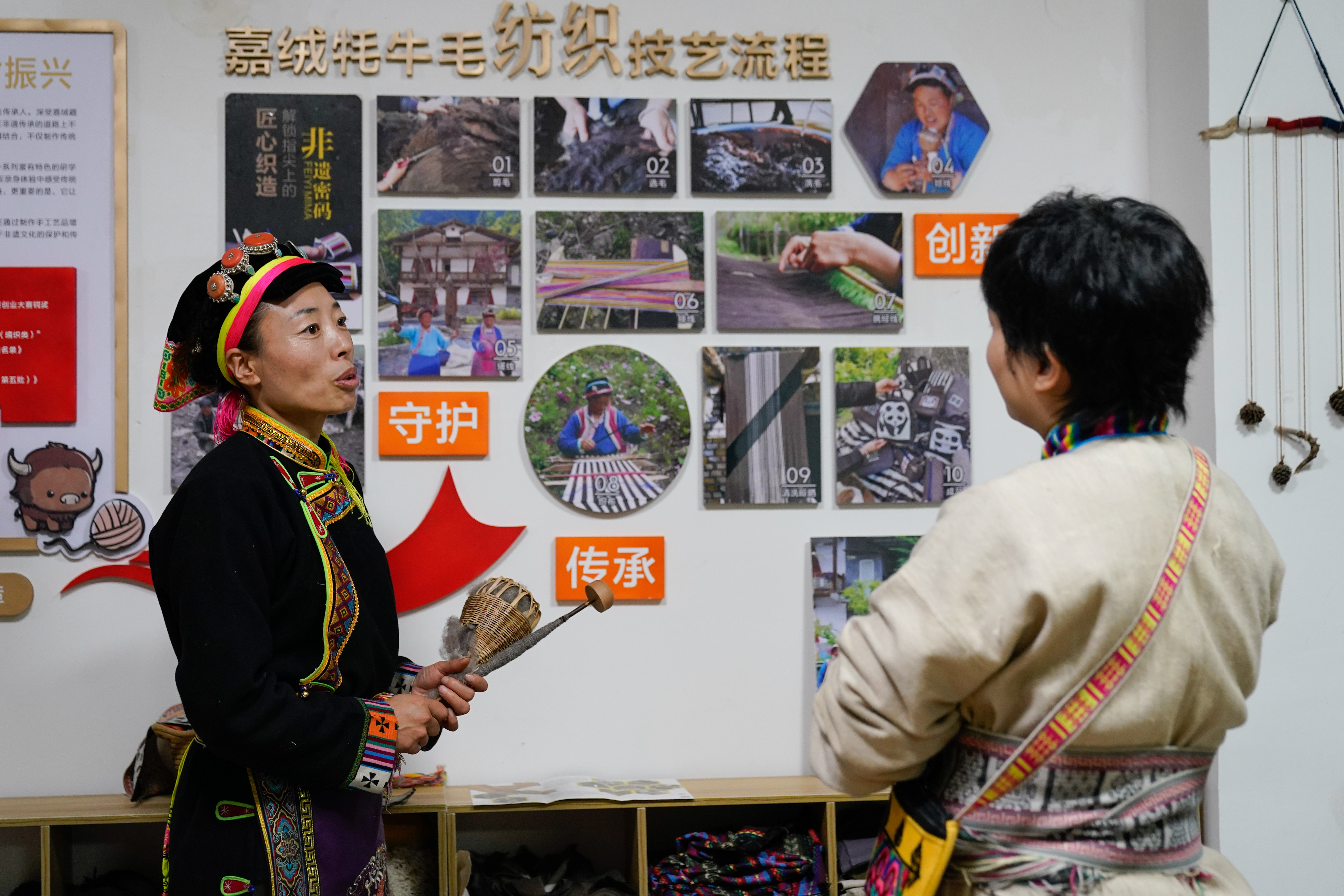 ↑10月7日,能卡曼(左)在工作室为游客介绍牦牛毛纺织技艺流程。新华社记者 胥冰洁 摄