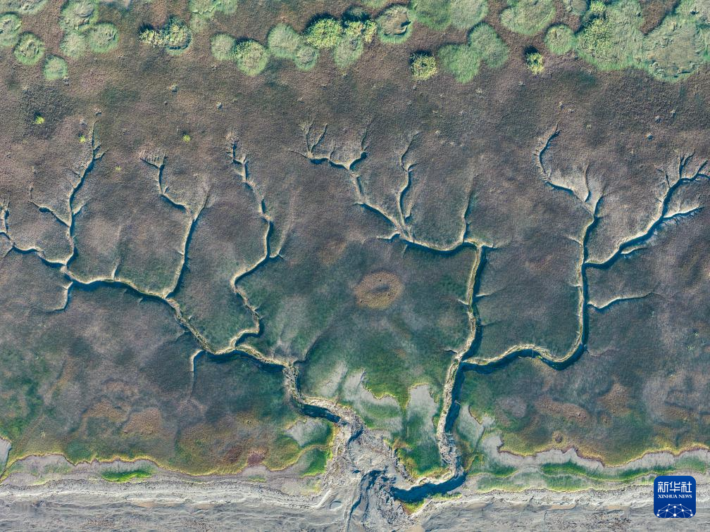 这是10月11日在浙江嘉兴海宁拍摄的钱塘江退潮后的“潮汐树”(无人机照片)。新华社记者 徐昱 摄