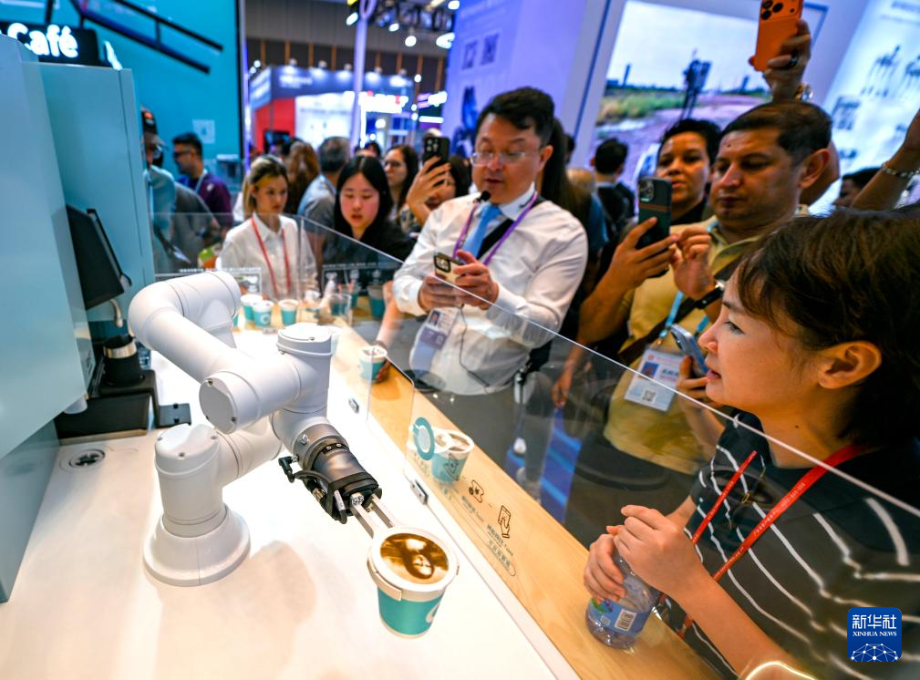 10月15日,在第138届广交会服务机器人专区,展商向观众展示一款商用咖啡机器人设备。新华社记者 肖恩楠 摄