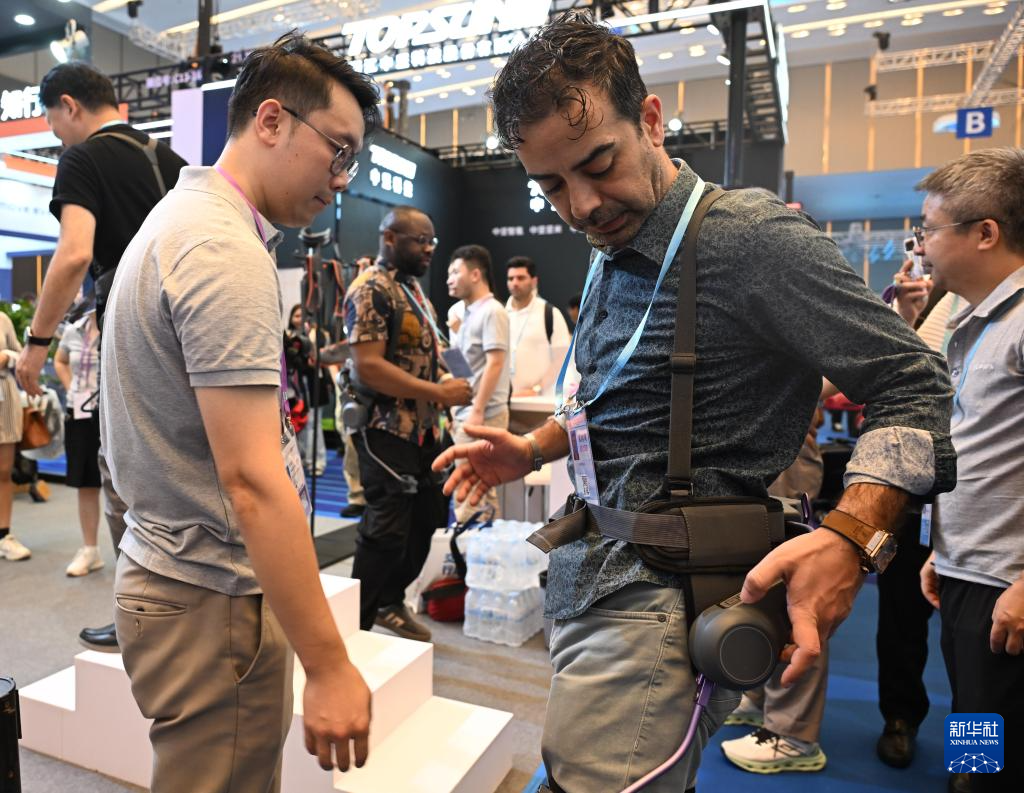 10月15日,境外采购商在第138届广交会服务机器人专区太希智能展台体验登山助行外骨骼穿戴设备。新华社记者 肖恩楠 摄