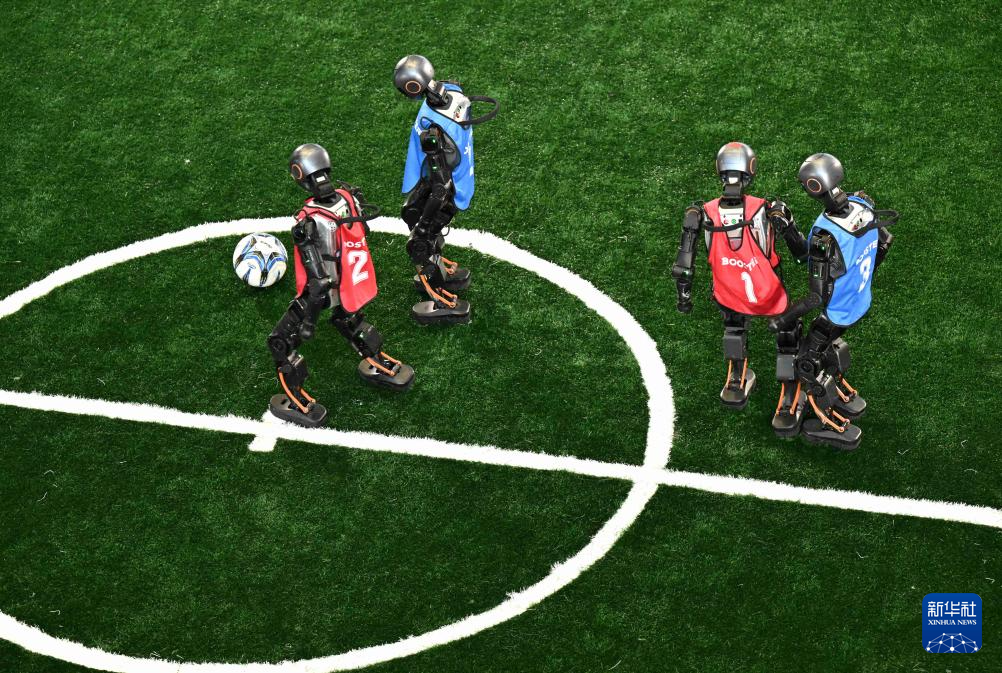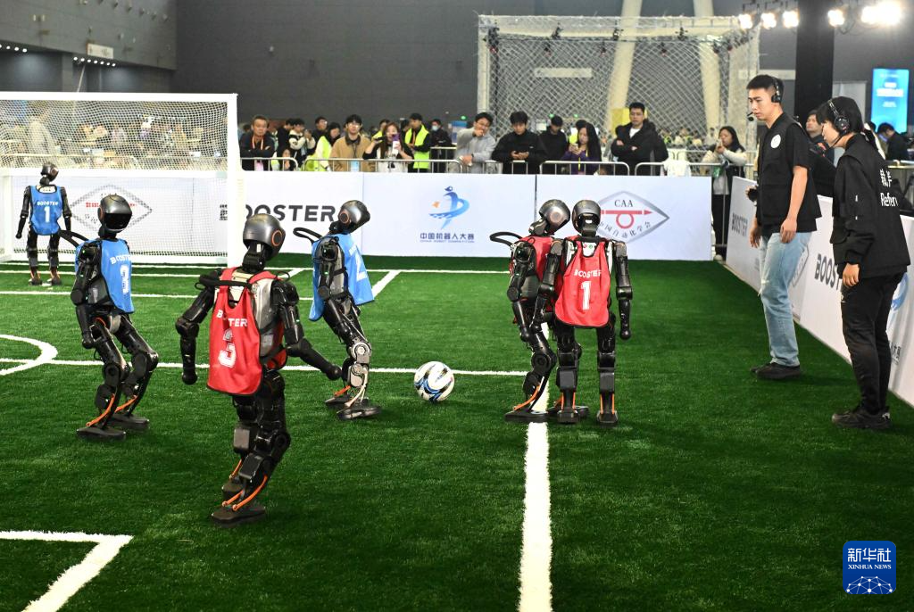 10月17日,机器人在河北省石家庄国际会展中心进行足球比赛。新华社发(陈其保摄)