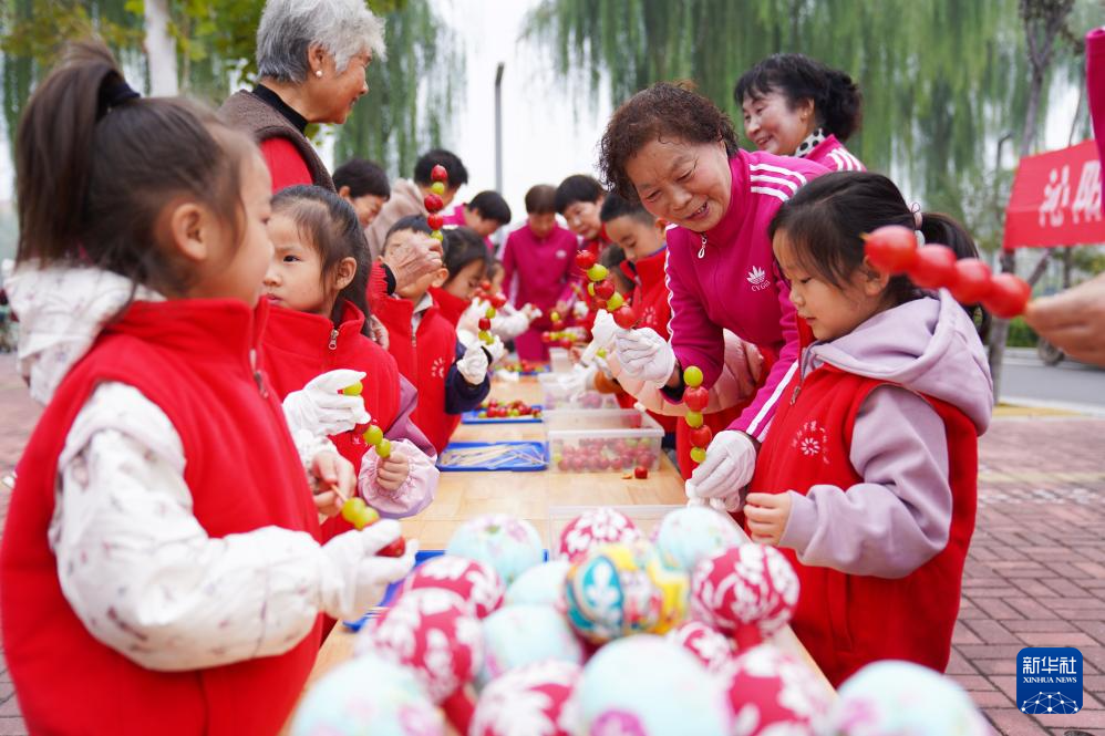 10月28日,河南省沁阳市第一幼儿园的孩子们与老人一起动手制作甜品。新华社发(张新雨摄)