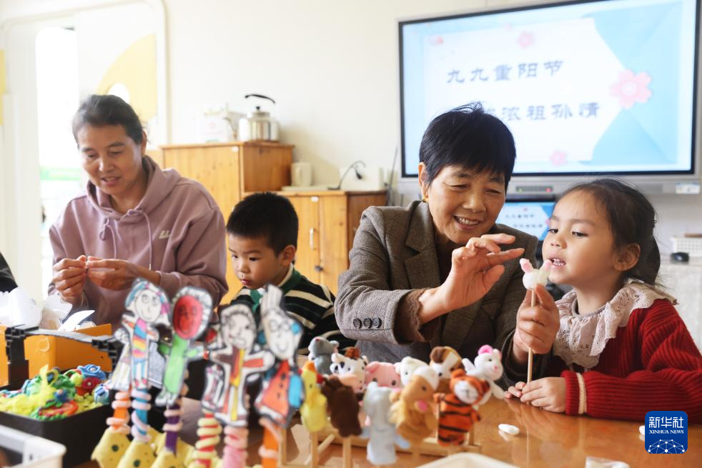 10月28日,在浙江省湖州市德清县乾元镇第一幼儿园,孩子们和老人一起制作戏偶。新华社发(倪立芳摄)