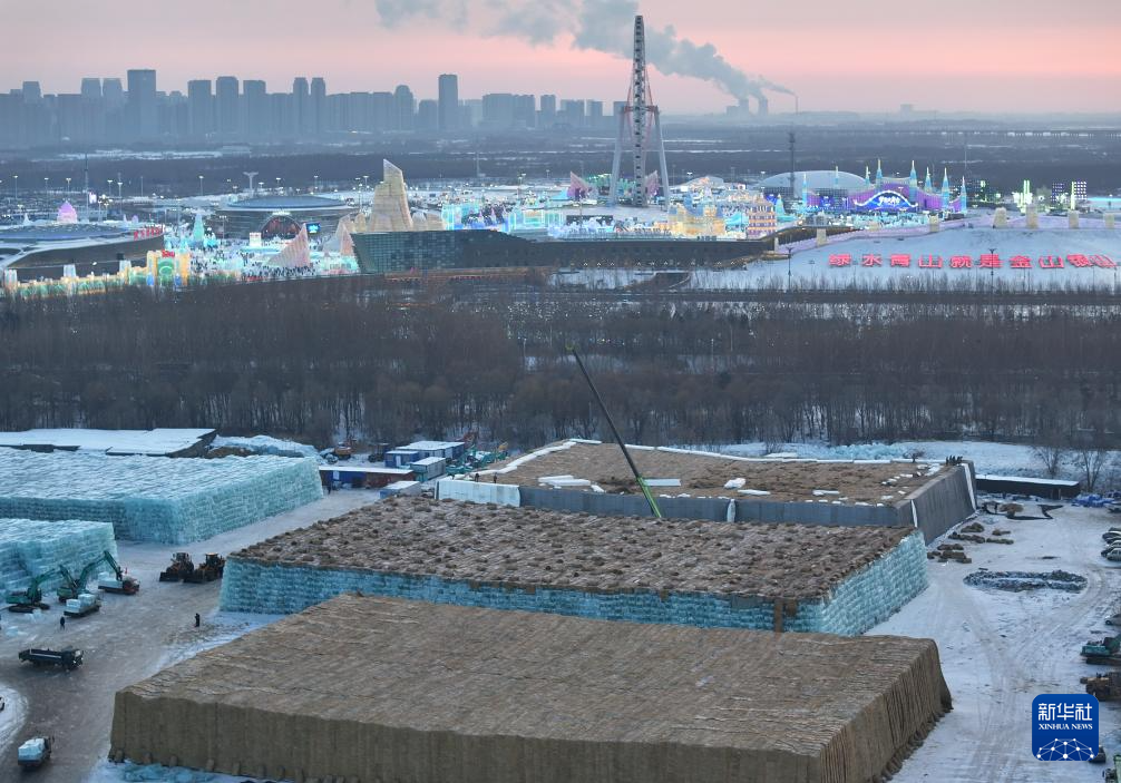 1月22日,工人在哈尔滨冰雪大世界储冰场上为冰块盖上遮盖物(无人机照片)。新华社发(张树摄)