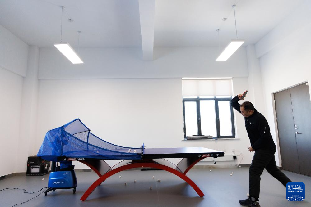 1月25日,漠河站站长施胜浦在活动室打乒乓球。活动室配备了发球机,方便站里只有一人值守时活动。新华社记者 金立旺 摄