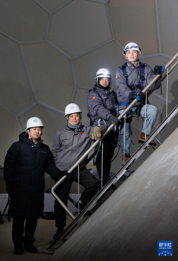 漠河站站长施胜浦(左二),工程师高景飞(左一)、李强(左三),助理工程师田冬在天线罩内合影(1月24日摄)。新华社记者 金立旺 摄