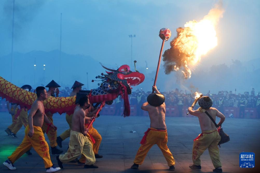 2月27日,在广西宾阳县炮龙文化广场,人们在炮龙节上舞炮龙。新华社记者 陆波岸 摄