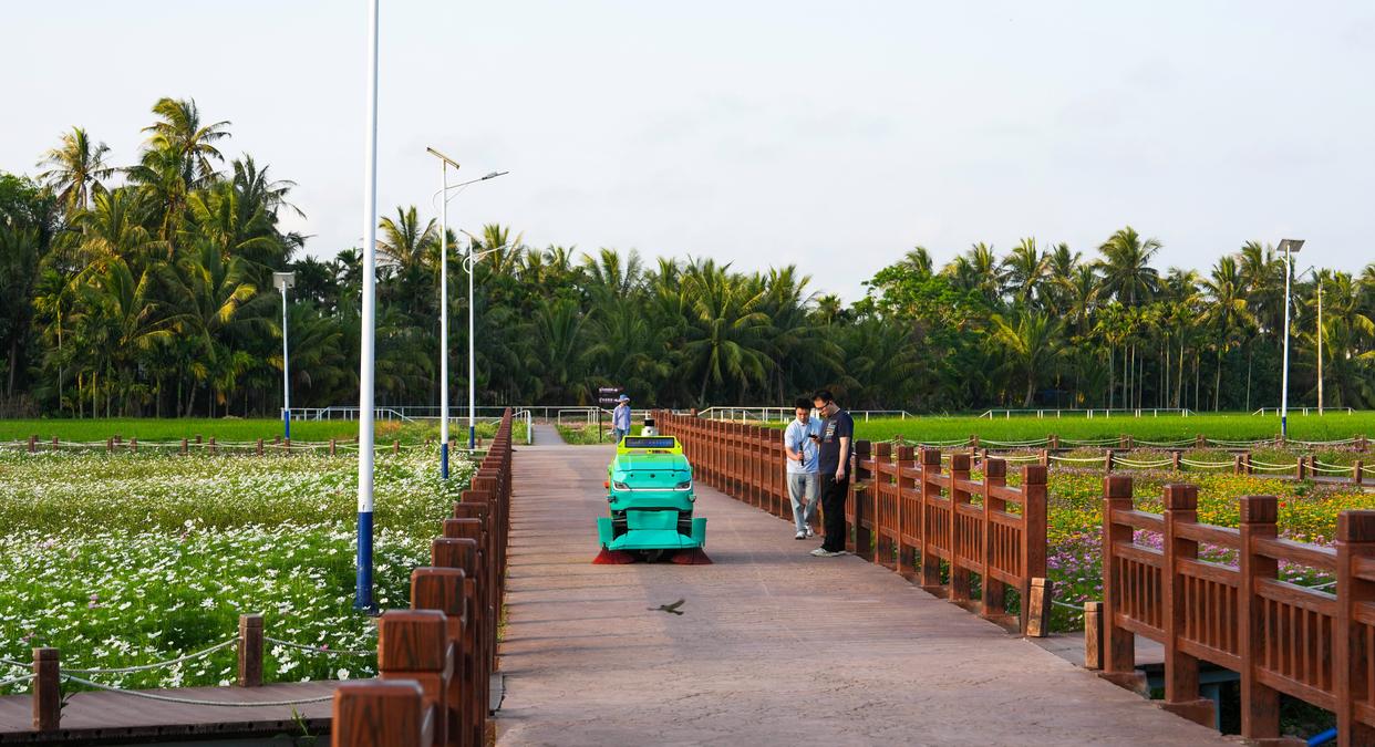 智能清扫机器人在海南省琼海市博鳌镇南强村作业(3月23日摄)。新华社记者 杨冠宇 摄