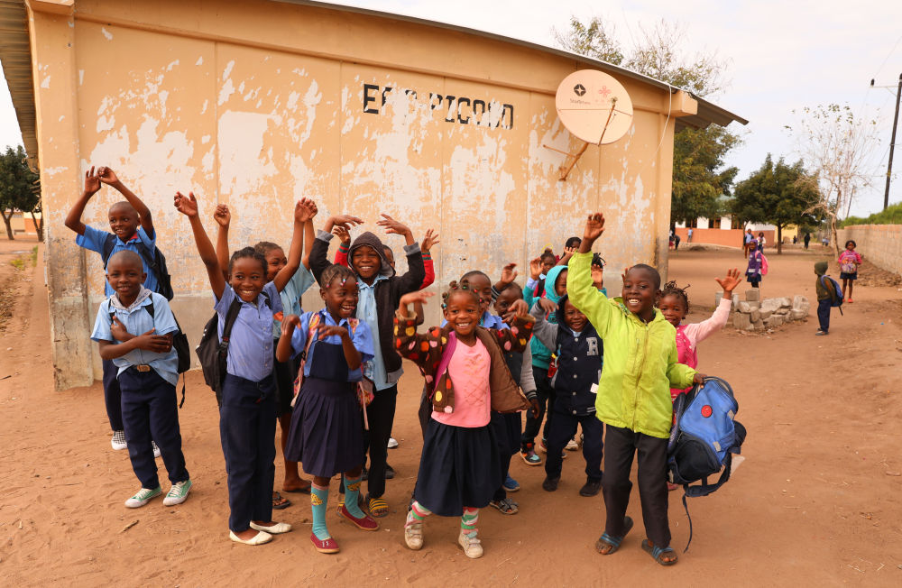 △2023年7月25日,莫桑比克马普托省皮科科村学校的孩子们站在装有中国援助的卫星电视接收天线的房屋前。