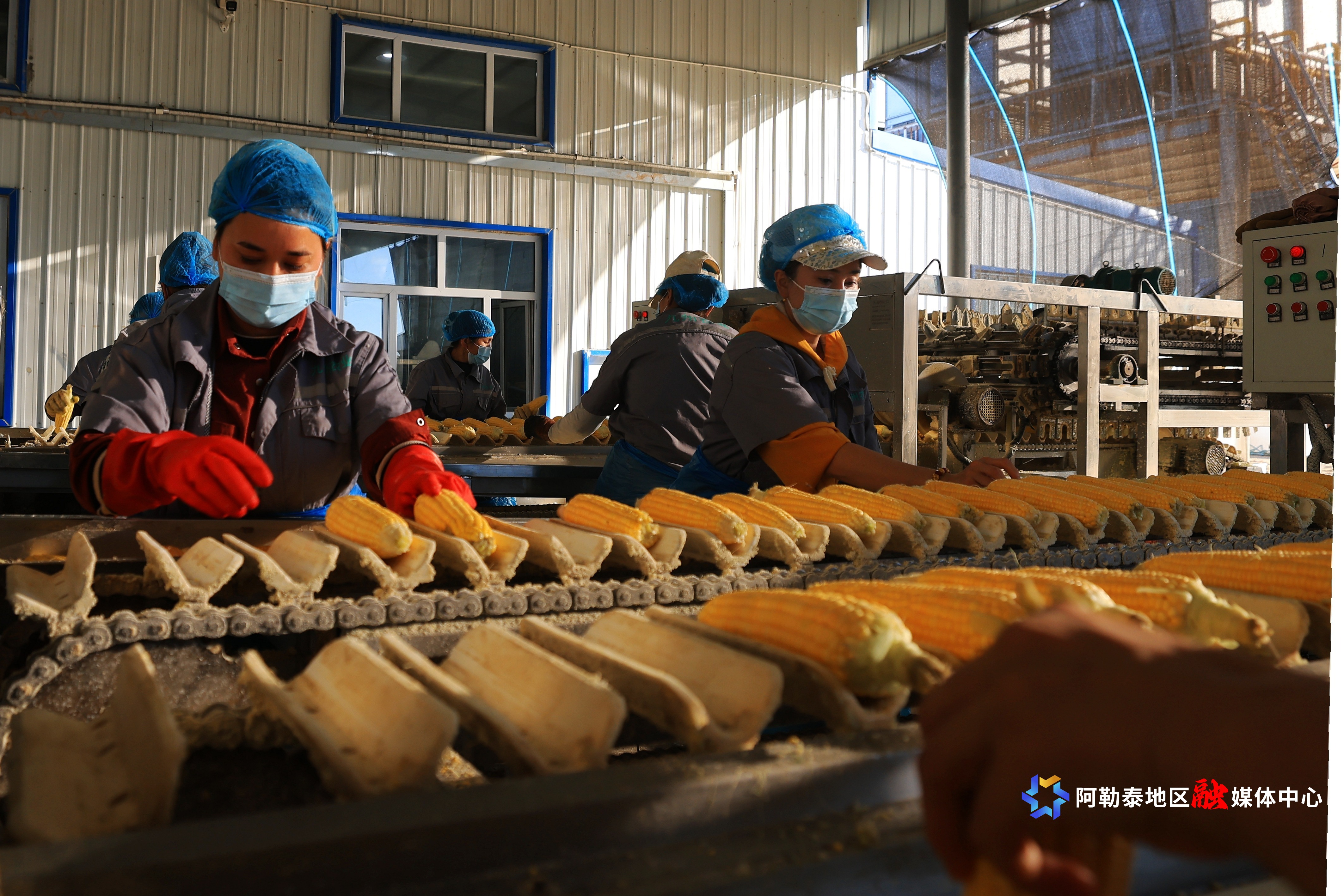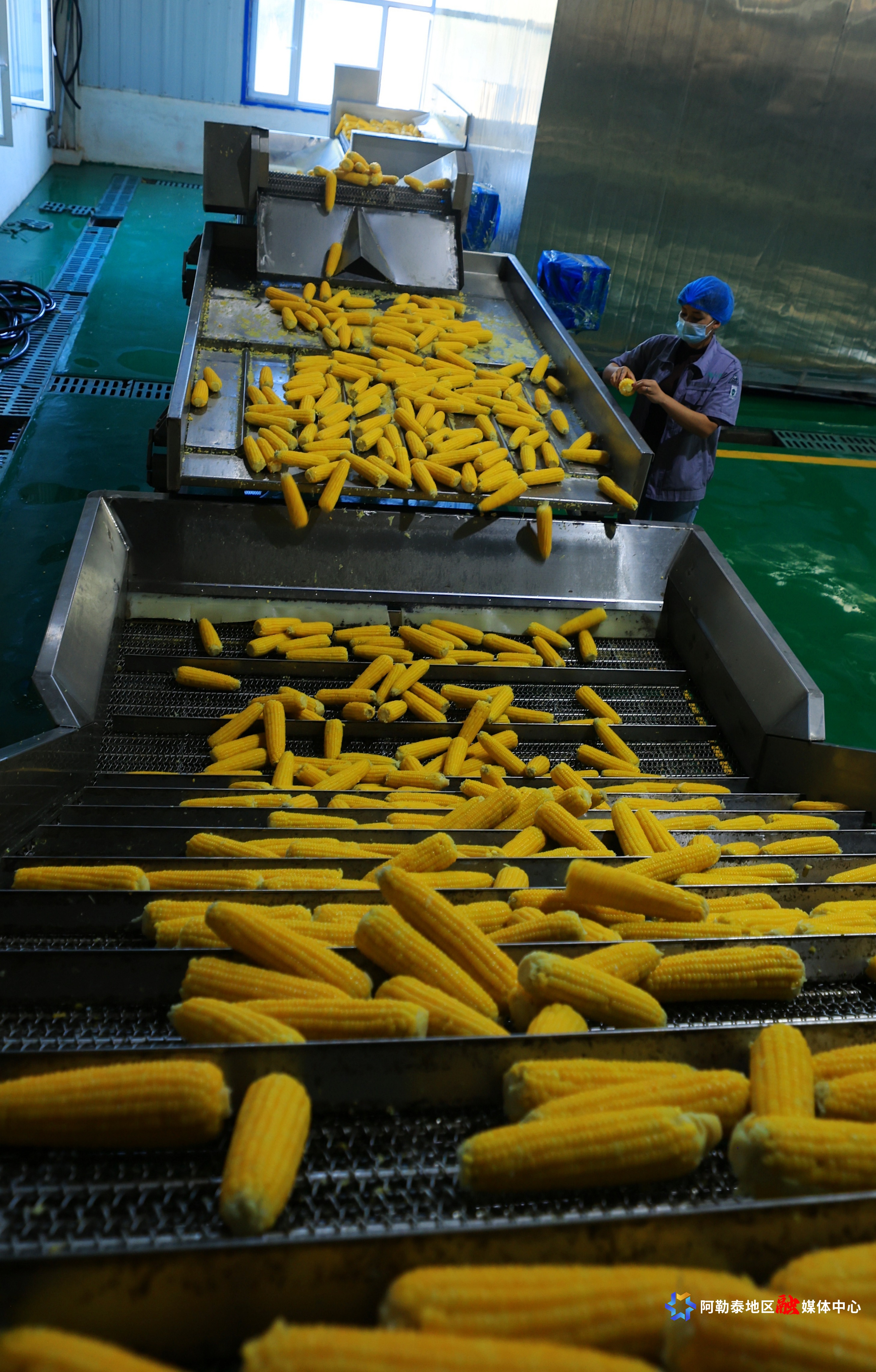 阿勒泰新闻网-阿勒泰地区融媒体中心(记者 阿尔达克·拜斯汗)9月16日,福海县喀拉玛盖镇九州农业发展有限公司职工在生产车间加工鲜食玉米。近年来,福海县进一步延伸鲜食玉米种植、加工产业链,推动传统玉米产业转型升级,让鲜食玉米成为村民增收致富的“香苞米”。