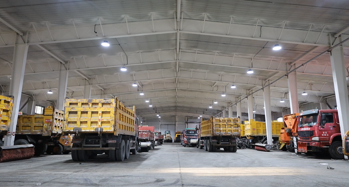 多辆清雪车辆整齐停放,随时待命投入除雪作业。
