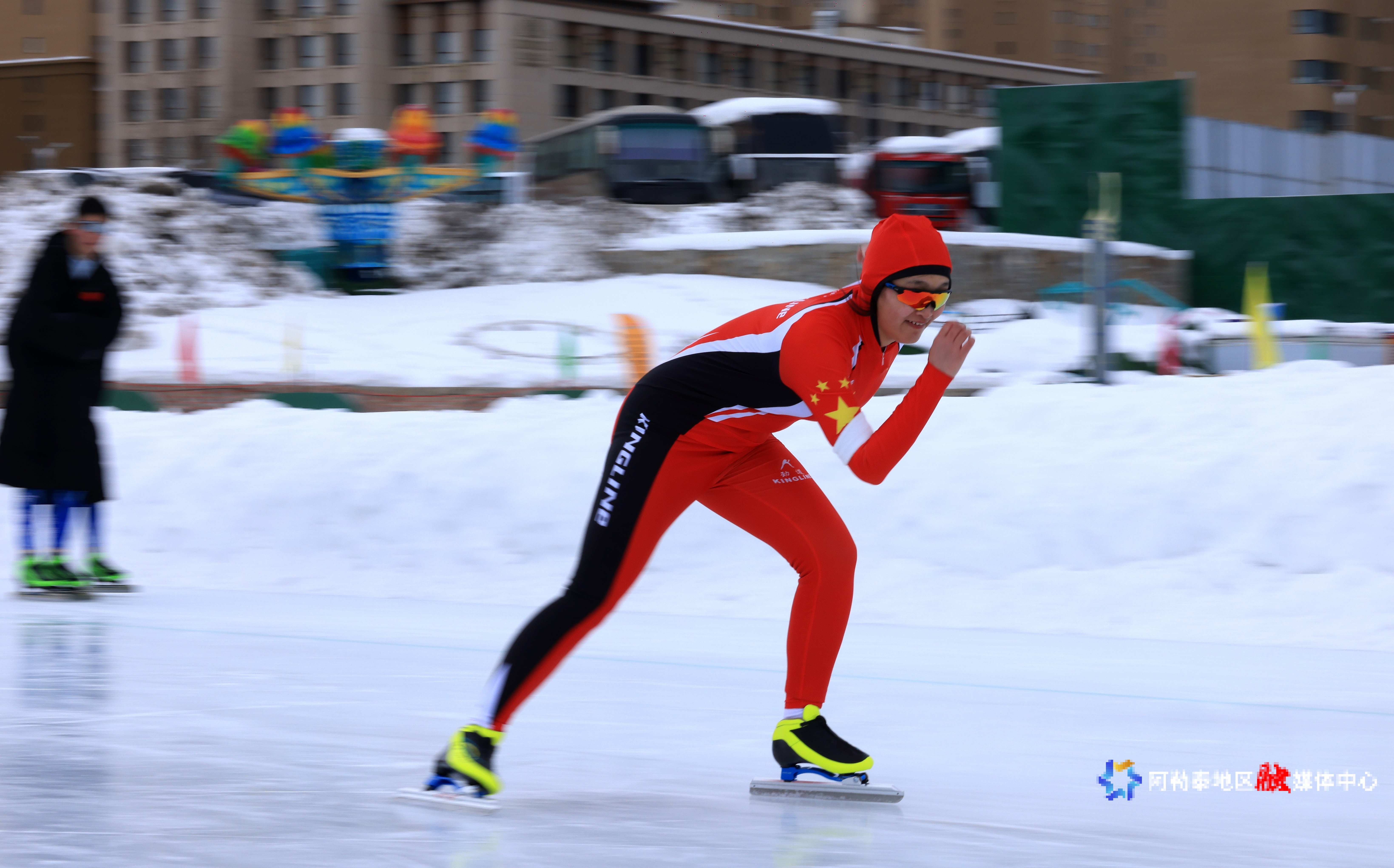 同日,在阿勒泰市全季体育公园,速度滑冰比赛火热进行。参赛选手如离弦之箭冲出起点,弯腰屈膝、摆臂加速,身姿矫健。他们在直道上全力冲刺,在弯道处灵活控速,场边教练与队友的呐喊助威声此伏彼起。