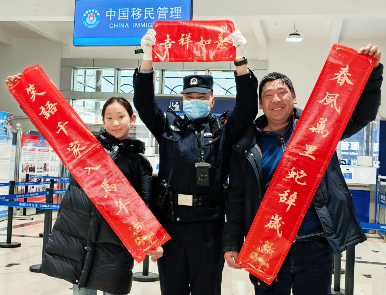 口岸联检大厅内,大红灯笼与喜庆“福”字相映成趣。刚踏入国门的中国公民,还未卸下旅途的疲惫,便收到了民警递来的“福”字和新春对联。对于常年在外奔波的游子而言,这抹亮眼的“中国红”,不仅是一份节日礼物,更是祖国怀抱最温暖的象征。