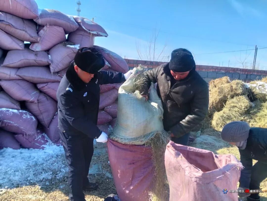 富蕴县公安局克孜勒希力克乡派出所民警,主动帮助牧民阿先生装运牲畜饲料,解决生产生活难题。