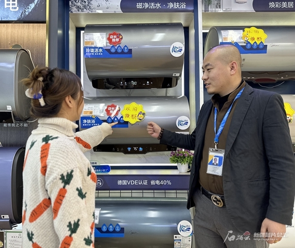 1月11日,在新疆苏宁易购商贸有限公司乌鲁木齐华凌店,店员为顾客介绍热水器以旧换新优惠政策。石榴云/新疆日报记者 马蓓摄
