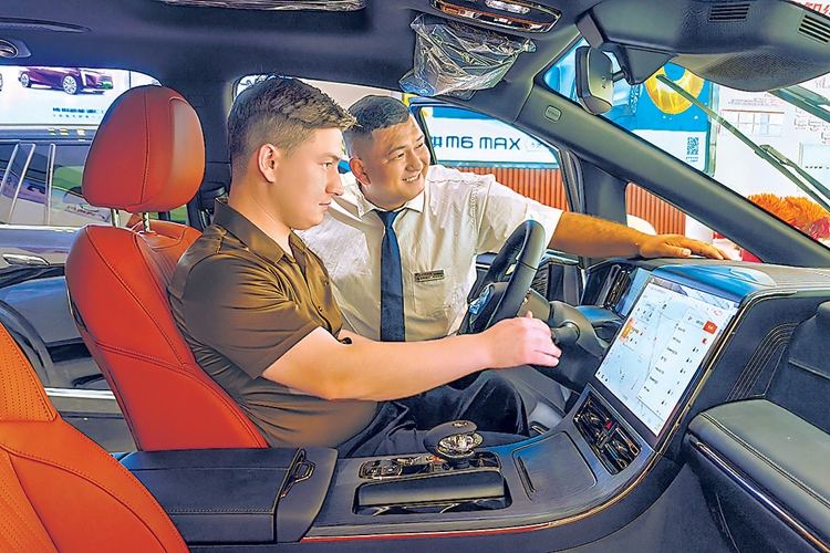 8月21日,和田市嘉海汽车城广汽传祺4S店销售人员在给顾客介绍享受以旧换新政策的新能源车。张亚辉摄