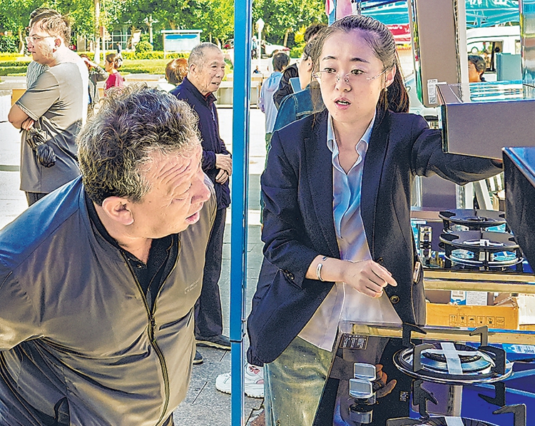 8月21日,博乐市兴乐商贸广场海尔电器专卖店工作人员为顾客介绍以旧换新政策。楠登摄