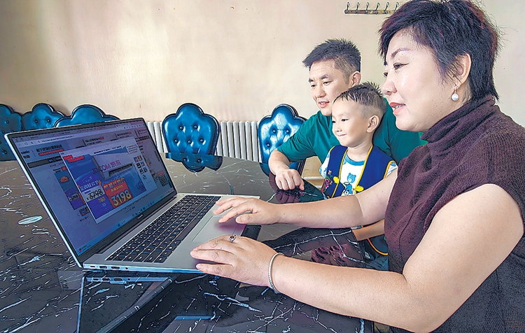 8月21日,察布查尔锡伯自治县察布查尔镇纳尔浑街西四巷居民陈志勇一家三口在网上选购享受以旧换新政策的空调产品。华岩明摄