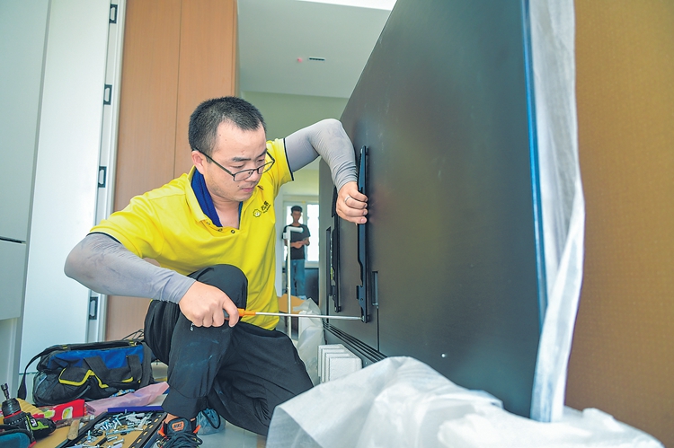 8月21日,昌吉市万博兰亭小区,工作人员给消费者安装通过以旧换新方式购买的智能电视。陶维明摄