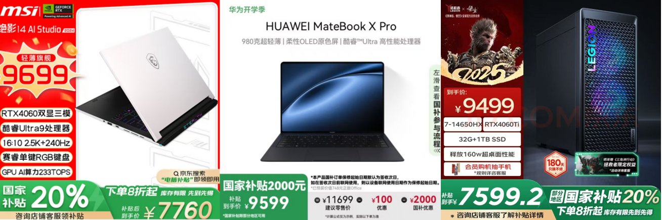 产品方面,许多新款或者爆款电脑均可享受国家补贴优惠。其中,华为MateBookXPro享受国家补贴后售价低至9599元,微星绝影14AIstudio游戏本享受国家补贴后售价低至7760元,联想拯救者刃7000K游戏主机台式电脑享受国家补贴后7599元到手,无论游戏还是办公需求,在京东下单的消费者均可享受优惠,以更划算的价格入手新款电脑产品。