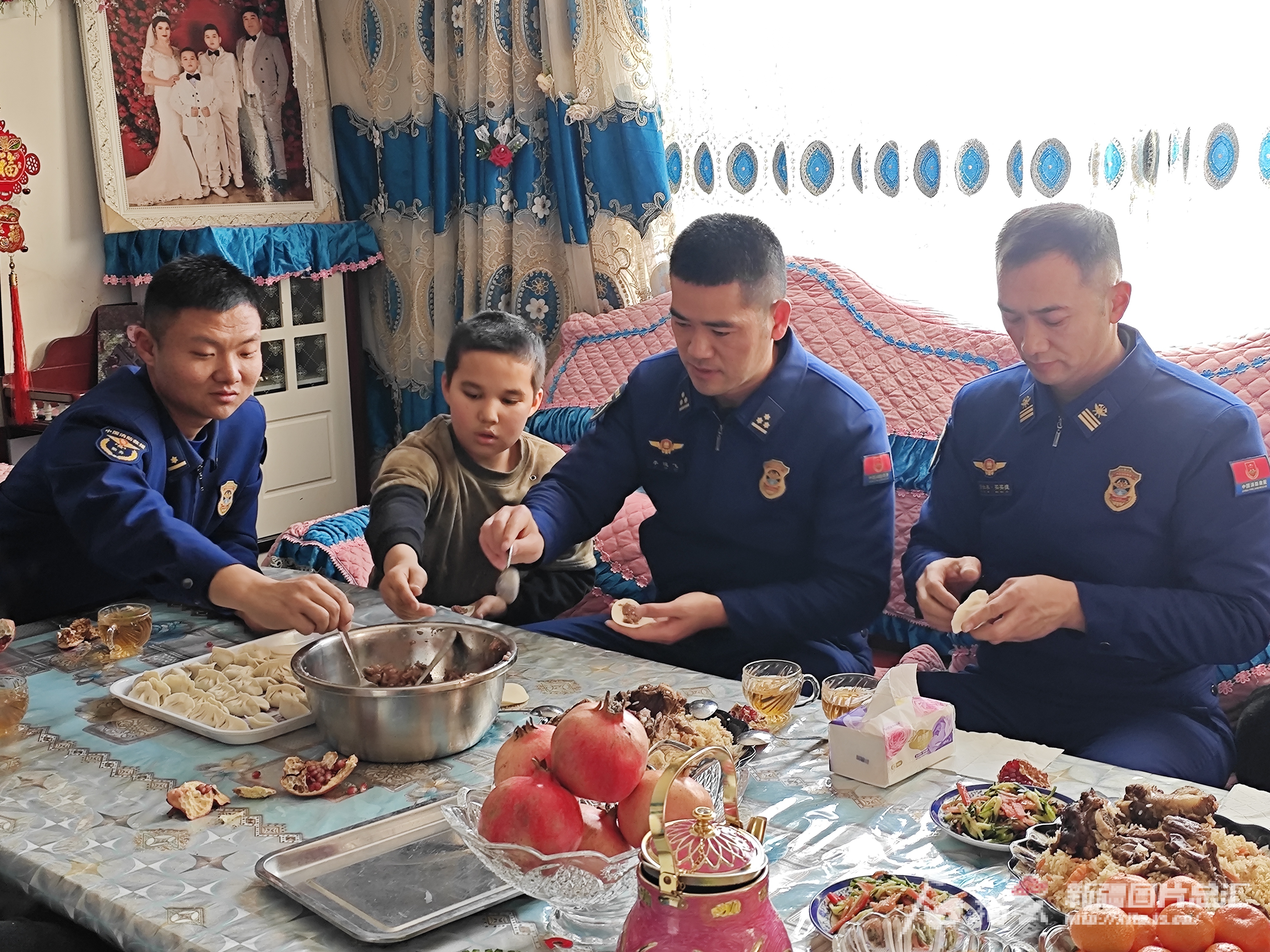2025年1月26日,全国人大代表、新疆消防救援总队阿克苏支队库车市大队长宁路消防救援站政治指导员李运飞和队员们来到吐尔逊·依米提家,一起包饺子,提前吃年夜饭。汪渝 摄
