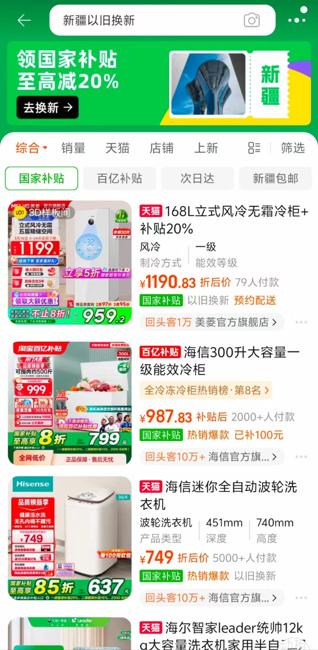 天山网-新疆日报讯(记者黑宏伟报道)记者从自治区商务厅获悉:近日,新疆家电、手机等产品以旧换新线上销售通道相继开通,消费者足不出户可享受国家以旧换新补贴。